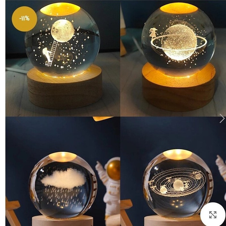 داخل این گویهای کریستالی با استفاده از تکنولوژی لیزر سهبعدی، طرحهایی بینظیر مانند کهکشان، منظومه شمسی، ماه، حیوانات فانتزی یا نمادهای عاشقانه حک شده که با روشن شدن نور از زیر، حال و هوایی رؤیایی خلق میکنند.